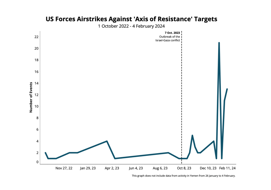 ACLED records more than 200 incidents of attacks and attempted attacks on US and Global Coalition forces across the Middle East by members or suspected members of the axis of resistance in the past four months — a 20 times increase compared to the preceding four-month period. In the 12 months before 7 October events, only about 30 similar events had been reported in the region.