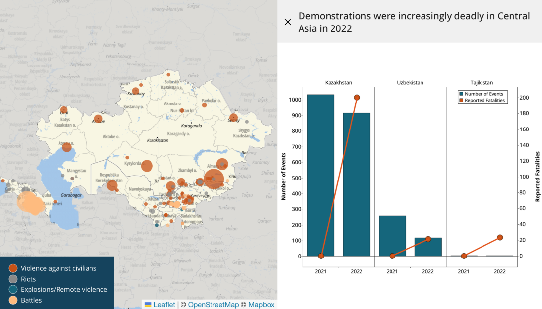 The region also grappled with widespread domestic turmoil, as security forces suppressed demonstrations in Kazakhstan, Tajikistan, and Uzbekistan. The year 2022 began with mass demonstrations in Kazakhstan over a liquified petroleum gas (LPG) price hike. Unable to suppress the growing discontent, not only with LPG prices but also the rising cost of living and economic stagnation, the government allowed state forces to use live ammunition, granting a “shoot-to-kill” order.7 As the Kazakh government claimed to have also arrested 12,000 people during the first two weeks,8 ACLED records at least 200 fatalities from the violence, though human rights groups warn the actual number of fatalities may be higher.9