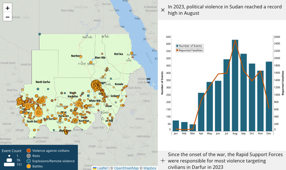 The ACLED Conflict Index highlights the intensity of the war in Sudan, with the country ranking fourth in the indicator for the deadliness of reported violence. Airstrikes and shelling targeting residential neighborhoods have claimed thousands of civilian lives in Khartoum’s tri-city area, home to some of the most intense fighting since April 2023. In Darfur, where the RSF is allied with ethnic Arab militias, evidence has emerged of mass atrocities perpetrated against non-Arab ethnic groups, sparking accusations of ethnic cleansing and war crimes.5 After the killing of no fewer than 800 people of the Masalit group at the hands of the RSF and allied militias in the Ardamata refugee camps, the European Union High Representative, Josep Borrell, linked the killings to “a wider ethnic cleansing campaign conducted by the RSF with the aim to eradicate the non-Arab Masalit community from West Darfur” and warned of “another genocide” unfolding in the region.6