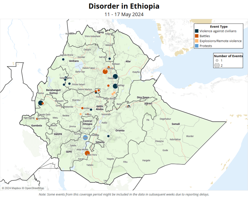 In Amhara region, battles between the Ethiopian National Defense Force and Fano militias were reported in South Wello and North Wello zones. In addition to clashes, the government conducted a number of airstrikes, including one strike on 12 May in Kewet woreda, North Shewa zone, that reportedly killed seven civilians. A second strike on the same day in Tarema Ber woreda, North Shewa zone, reportedly led to the death of three Fano members and four civilians.