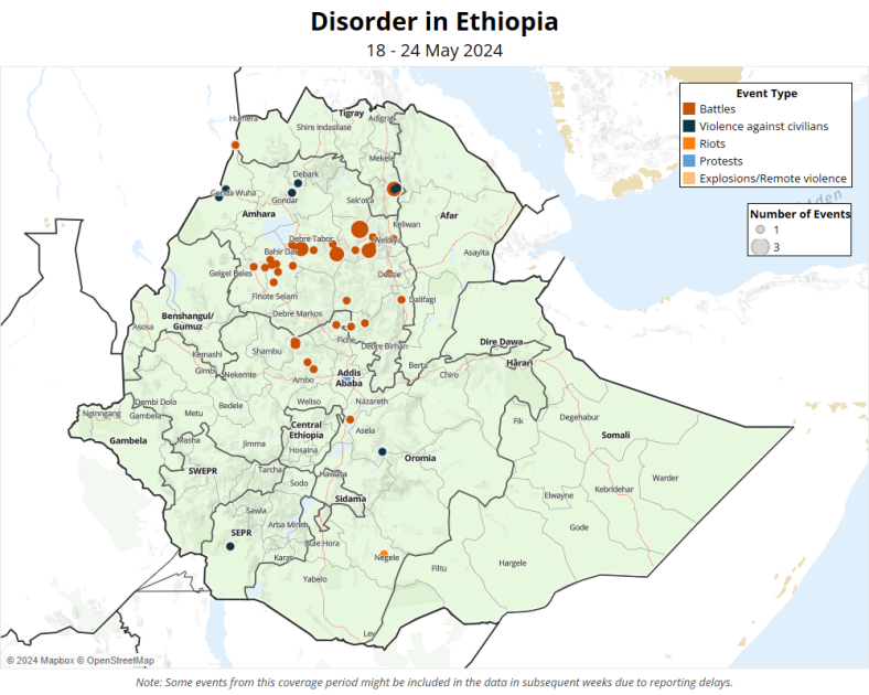 The data cover the period from 18 May to 24 May 2024. For more information about how ACLED collects data and categorizes events, see the ACLED Codebook. Some events from this coverage period might be included in the data in subsequent weeks due to reporting delays.