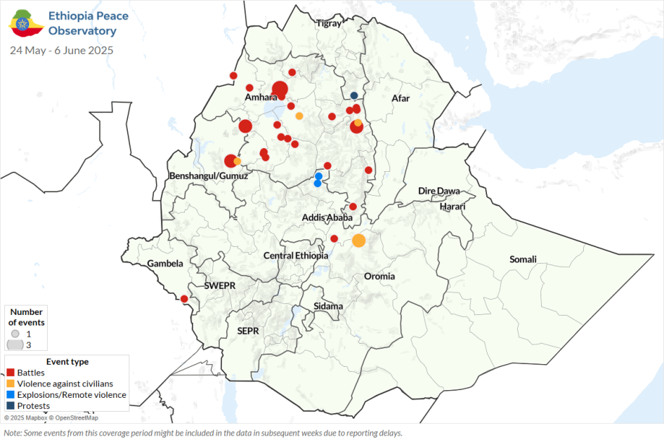 Update on Ethiopia covering 24 May - 6 June 2025, including analysis on violence in Oromia and Tigray.