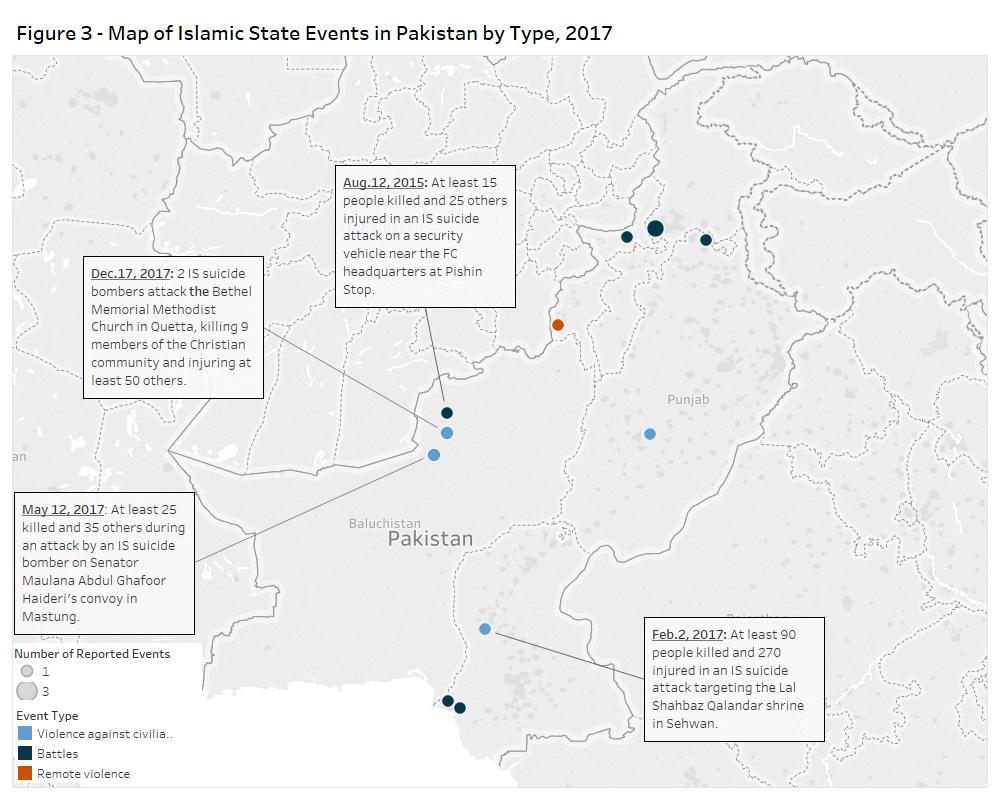In 2017 and into 2018, IS’ focus has shifted towards the border regions with Afghanistan in Balochistan, Khyber Pahtunkwa, and FATA. However, the group still retains a presence in Karachi. Notably, while IS claimed responsibility for one major suicide attack in Khuzdar district the previous year, there were four such attacks in 2017, half of which occurred in Balochistan province. This shift to more blatant acts of violence against civilians implies a desire to remain relevant in the Pakistan context despite losing ground in CTD raids (see Figure 3).