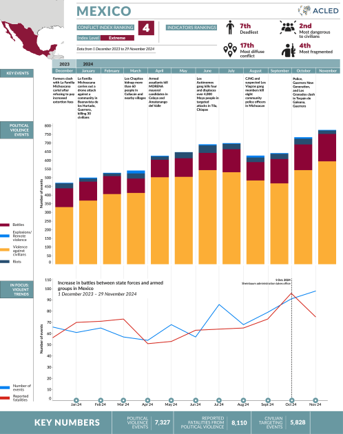 This infographic provides a snapshot of political violence data and key events from 1 December 2023 to 29 November 2024 for Mexico, a country that ranks in the extreme category in the December 2024 update of the ACLED Conflict Index.