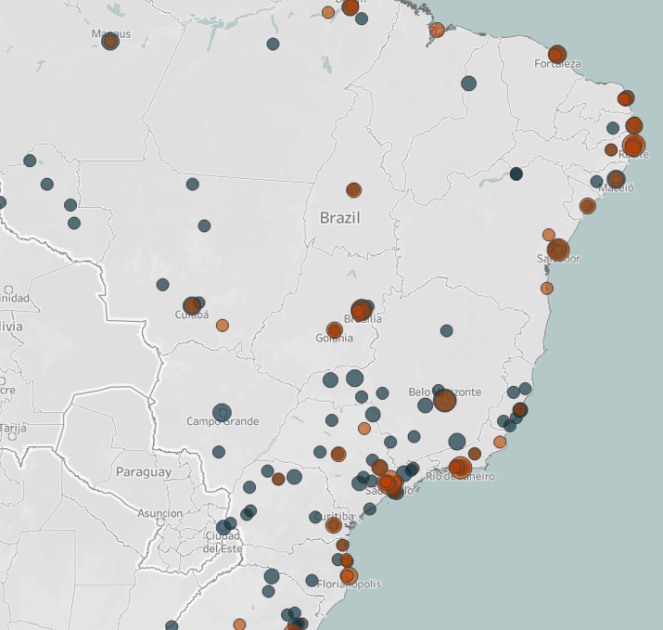 Although pot-banging protests are more common than motorcades between March and June 2020, motorcades are more widely distributed across the country, with events reported in all but one of Brazil’s 26 states as well as in the Federal District and the countryside. Pot-banging protests, on the other hand, are recorded in 21 states, and are mostly concentrated in and around larger urban centers (see map below).