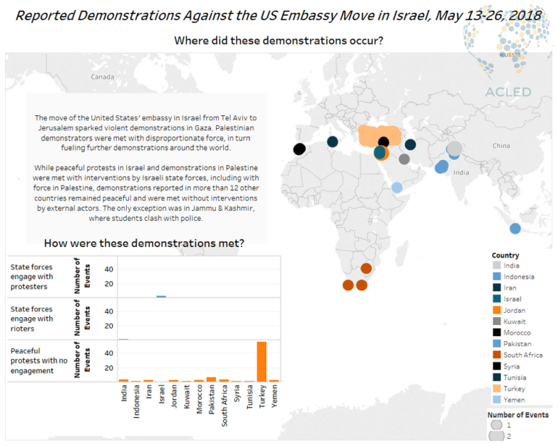 The highest number of demonstrations was recorded in Turkey where 56 protest events were reported. In all of these events, security forces did not intervene and protests remained peaceful in nature without any clashes reported. The only country in which security forces did intervene to stop peaceful protests was in Israel, specifically in Jerusalem and Haifa, where Arab residents protested in solidarity with the Palestinians. Additionally, Israeli authorities not only injured some of the protesters, but also arrested the organizers of the marches. This reaction is in line with past Israeli responses to pro-Palestinian protests (HRW, January 2018). The only other demonstration with an intervention by security forces was in the Jammu & Kashmir region of India, where students protested over the violence in Gaza and clashed with police attempting to disperse them.