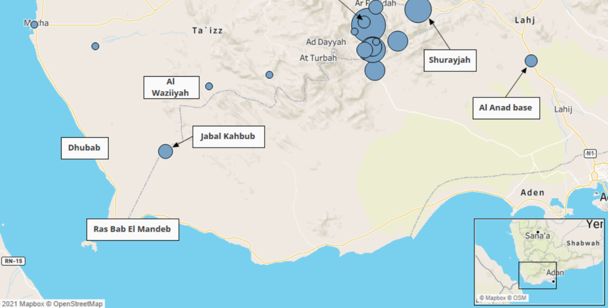 One important note on the activity of the Hazm Brigades is that it is likely underrepresented due to sourcing limitations. Some sources, for instance, are likely to include them under the banner of the Southern Resistance, or group them under generic labels such as ‘southern armed forces.’ Pro-Houthi reporting also refers to any opponent forces as ‘aggression forces’ or ‘mercenary forces.’ In addition, it seems that it took the media some time to take note of the brigades after their creation and to start treating them as independent entities. As a result, and because ACLED only codes the Hazm Brigades in an event when they are explicitly mentioned by the source, the number of events in which they are recorded may amount to an underestimate, particularly around Jabal Kahub, where most events were sourced using pro-Houthi media at a time when the brigades were relatively unknown.