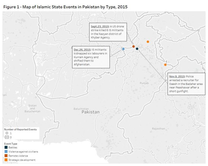 In 2015, the Islamic State established mixed cells within the country’s more vulnerable areas, notably Khyber Pahtunkwa and the international border regions of the FATA and Punjab province. Incidents of direct confrontation between IS and security forces in 2015 were minimal, limited for the most part to the arrest of recruiters and strikes on small cells in and around FATA (see Figure 1).