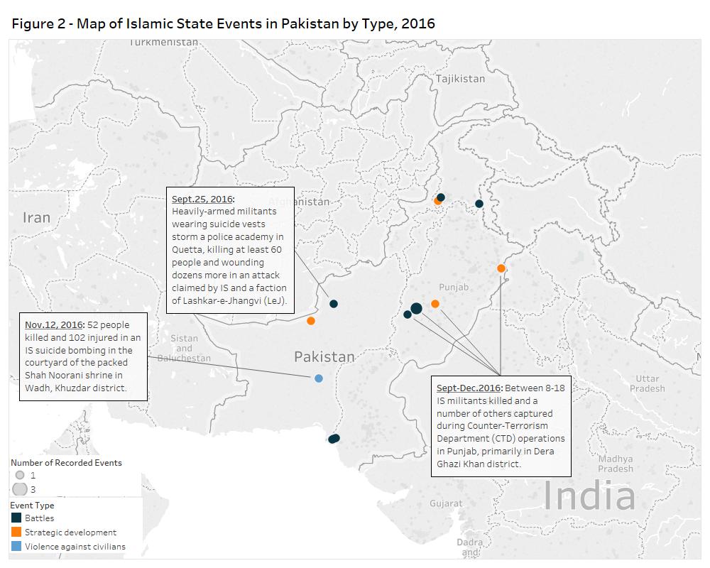 Islamic State's appearance and activities in Pakistan from 2015 onward, focusing on violence and CTD operations.