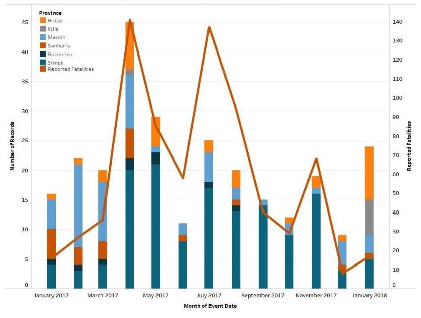 Figure 1: Events by Province Bordering Syria in Turkey (January 2017 to January 2018)
